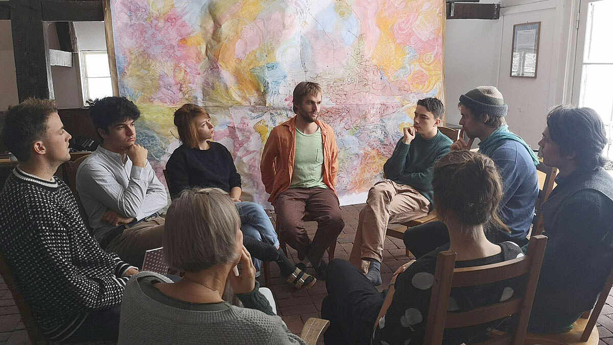 Wichtig war es uns, eigenständig in der eigenen Seele suchend, aber auch im Spiegel der Gemeinschaft seelisch beobachtend zu ertasten, welche Antworten gefunden werden sollen, welcher Schatz gehoben werden will. Dies führte uns auf einen Weg verschiedener Einheiten, von einführenden Impulsvorträgen über Naturbeobachtung der winterlichen Umgebung und Zwiegesprächen beim Spaziergang bis zu verschiedenen künstlerischen Übungen aus dem Clowning und Plastizieren und dem großes Aquarell, das wir gemeinsam malten. Von dem Erlebten ausgehend, kamen wir dann in ein offenes Gespräch, aus dem sich zuletzt einzelne Themengruppen bildeten.