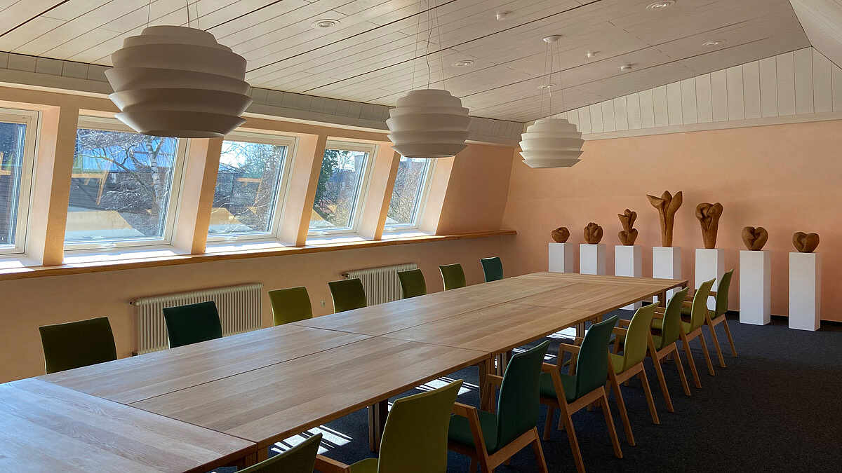 Begonnen haben wir mit kleinen Vorhaben, z.B. die Renovierung eines Sitzungszimmers und des Konferenzraums. Beide Räume strahlen nun die Frische und Freundlichkeit aus, die wir uns für das Haus wünschen und es lässt sich darin sehr gut arbeiten, wie uns inzwischen von verschiedenen Seiten bestätigt wurde. Das ist unser Ansporn, weitere Räume im Haus auf einen entsprechenden Stand zu bringen. Dem Großen Saal konnte während der diesjährigen Sommerpause mit einer Eins-zu-Eins-Renovierung der alte Glanz zurückgegeben werden. Auch der Innenhof, der das Dach der Cafeteria bildet, ist erneuert worden. Undicht gewordene Abdichtungen zur darunteliegenden Cafeteria wurden ersetzt, neue Bodenplatten ausgelegt. Blumenbeete konnten neu gefasst werden, einschließlich integrierter Sitzbänke. Parallel dazu wird auch die Cafeteria rundum erneuert. Diese Arbeiten sind fast abgeschlossen.